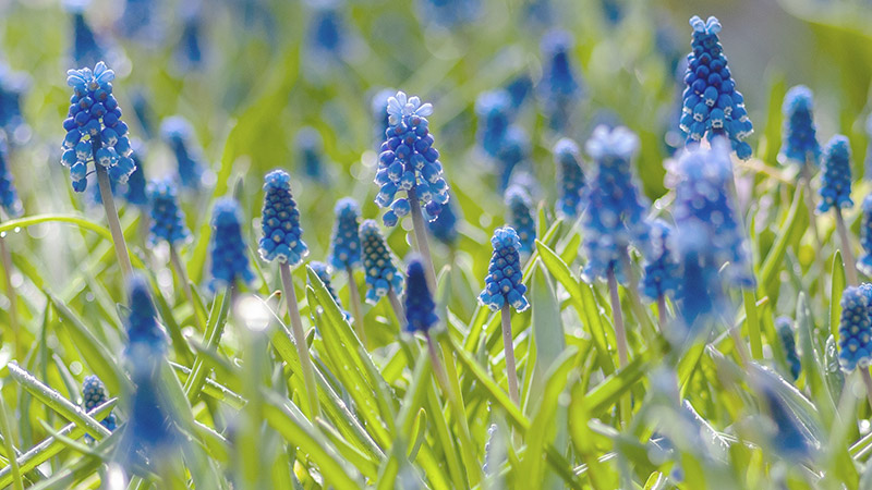 ムスカリは鮮やかな青紫色の花が春の花壇を彩り、チューリップなどほかの花を引き立てる名わき役といってもよい花です。丈夫で育てやすい秋植え球根で、丸い壺形の小花が、ブドウの房のように密集して咲く様子も愛嬌があります。植えっぱなしでも毎年よく咲き、グラウンドカバーとしても利用しやすく、青いカーペットを敷いたような景観がつくれます。